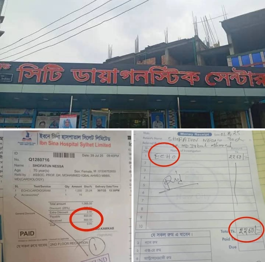 কিন্তু ০১ আগস্ট ২০২৫ তারিখে জুড়ীর সিটি ডায়াগনস্টিক সেন্টারে একই টেস্ট করাতে গিয়ে দেখা যায়, তার বিল ধরা হয়েছে ২২০০ টাকা। বিলের রিসিটও রয়েছে তাঁর কাছে।