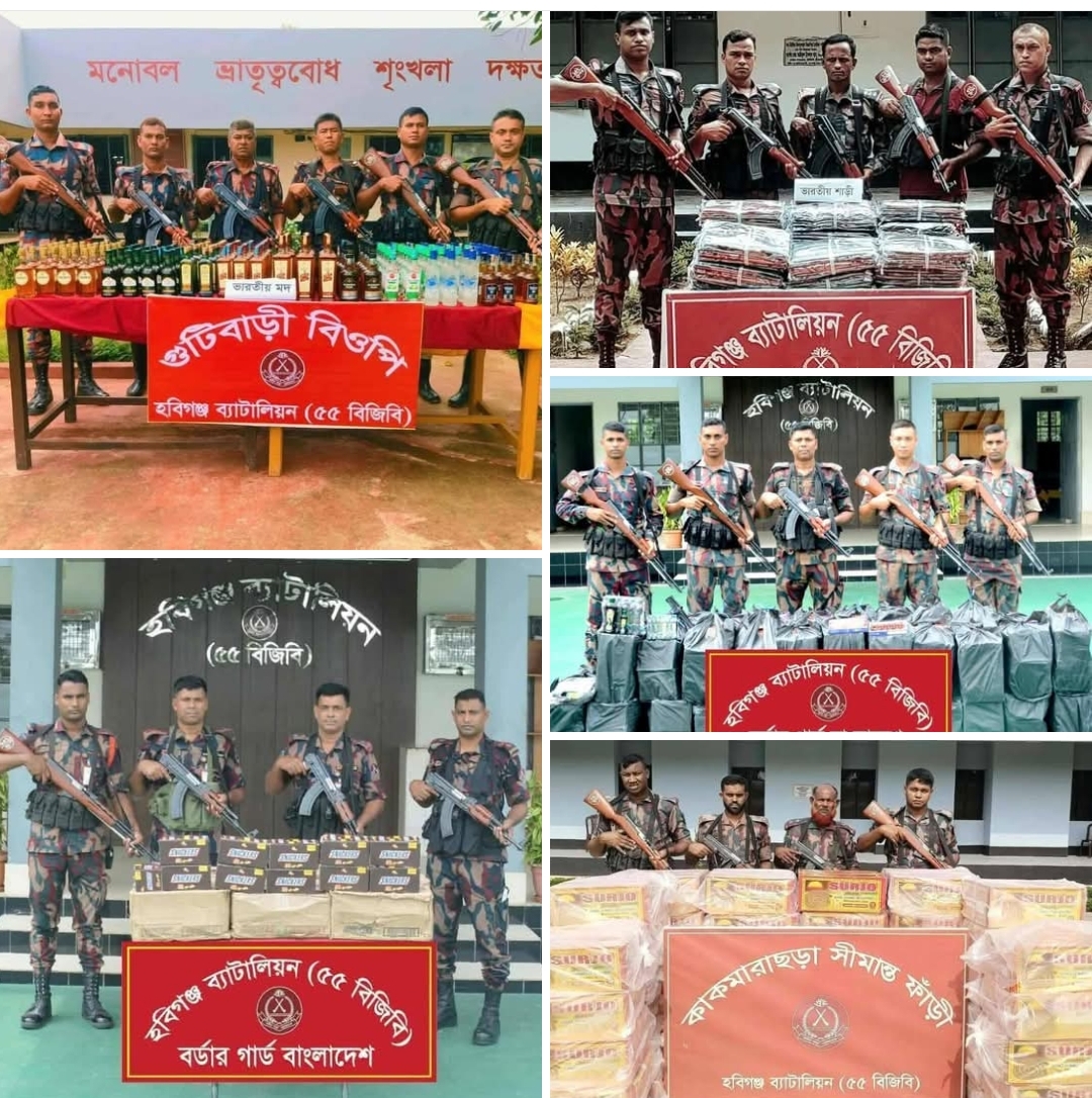হবিগঞ্জের ৫৫ বর্ডার গার্ড বাংলাদেশ (বিজিবি) সীমান্তবর্তী এলাকায় একযোগে ১০টি পৃথক বিশেষ অভিযান পরিচালনা করে প্রায় ২৪ লাখ ১৫ হাজার ৫০০ টাকা মূল্যের ভারতীয় গাঁজা, বিভিন্ন ধরনের মদ, দামি শাড়ি, কাবেরী মেহেদী, চকলেট, ফুসকা, সেগুন কাঠ ও মশার কয়েলসহ চোরাচালান পণ্য জব্দ করেছে।