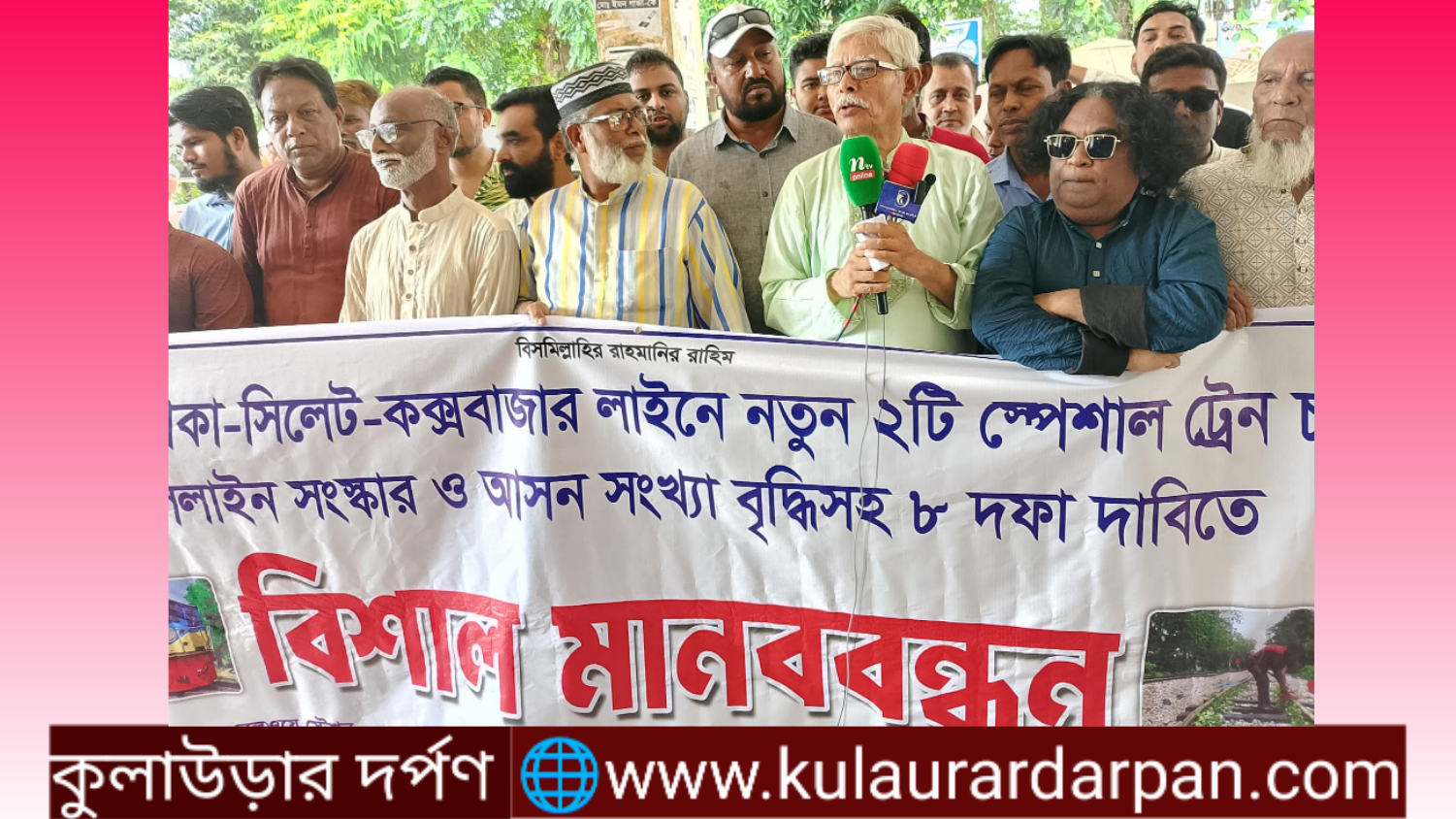 কুলাউড়া উপজেলায় সিলেট- ঢাকা, সিলেট- কক্সবাজার রেলপথে ২টি স্পেশাল ট্রেন চালু. আখাউড়া- সিলেট রেলপথ সংস্কার ও ডুয়েল গেজ ডাবল লাইনে উন্নীতকরণসহ ৮ দফা দাবিতে এক বিশাল মানববন্ধন কর্মসূচি পালন করে। ০৯ আগস্ট রোববার কুলাউড়া জংশন স্টেশনে এই মানববন্ধন কর্মসূচি পালিত হয়।