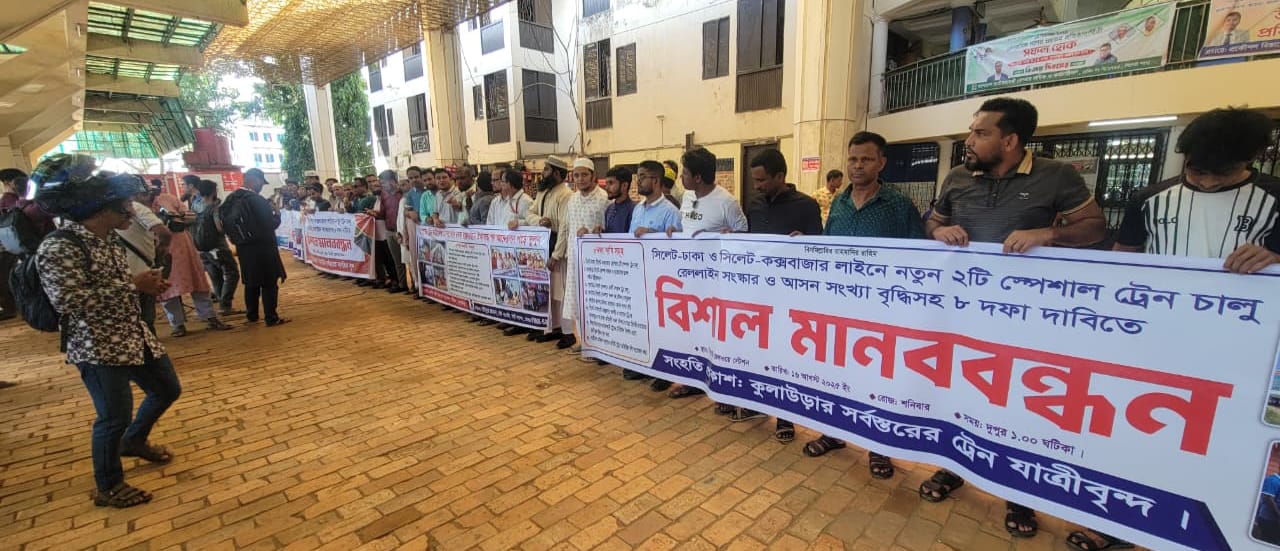 সিলেট-ঢাকা, সিলেট-কক্সবাজার রেলপথে ২টি স্পেশাল ট্রেন চালু, আখাউড়া-সিলেট রেলপথ সংস্কার ও ডুয়েল গেজ ডাবল লাইনে উন্নীতকরণসহ ৮ দফা দাবিতে সিলেট রেলওয়ে স্টেশনে এক বিশাল মানববন্ধন কর্মসূচি পালন করা হয়। শনিবার (১৬ আগস্ট) সিলেটের সর্বস্তরের নাগরিকবৃন্দ আয়োজিত মানববন্ধনে একাত্মতা পোষণ করে ৮ দফা দাবি বাস্তবায়ন আন্দোলন পরিষদ কুলাউড়া, কুলাউড়ার সর্বস্তরের ট্রেনযাত্রীবৃন্দ,