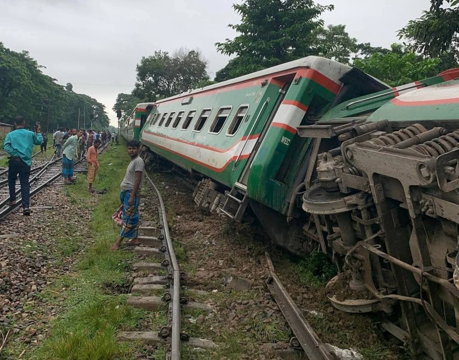 স্থানীয় সূত্রে জানা গেছে, ট্রেনটি মোগলাবাজার এলাকায় প্রবেশের সময় হঠাৎ একটি বগি লাইনচ্যুত হয়, পরে টান দিয়ে ইঞ্জিনসহ চারটি বগি ট্র্যাক থেকে ছিটকে পড়ে।