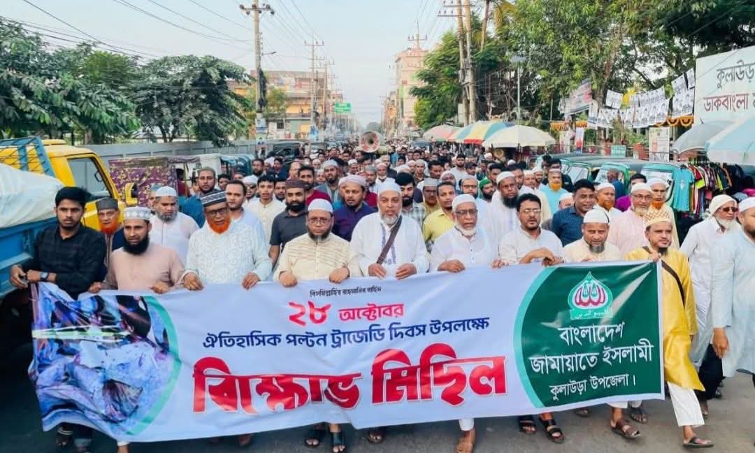 স্টাফ রিপোর্টার।। কুলাউড়ায় পল্টন হত্যা দিবস উপলক্ষে বাংলাদেশ জামায়াতে ইসলামীর কেন্দ্রীয় কর্মসূচির অংশ হিসেবে উপজেলা জামায়াতের উদ্যোগে এক বিক্ষোভ মিছিল ও পথসভা অনুষ্ঠিত হয়েছে।