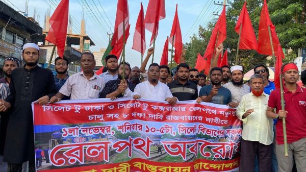 ষ্টাফ রিপোর্টার।। সিলেট বিভাগের রেলে যোগাযোগ ব্যবস্থা উন্নয়নের জন্য চলমান ৮ দফা দাবি বাস্তবায়ন আন্দোলনের অংশ হিসেবে ১ নভেম্বর রেলপথ অবরোধ কর্মসূচীর সমর্থনে বিশাল লাল পতাকা মিছিল সম্পন্ন হয়েছে।