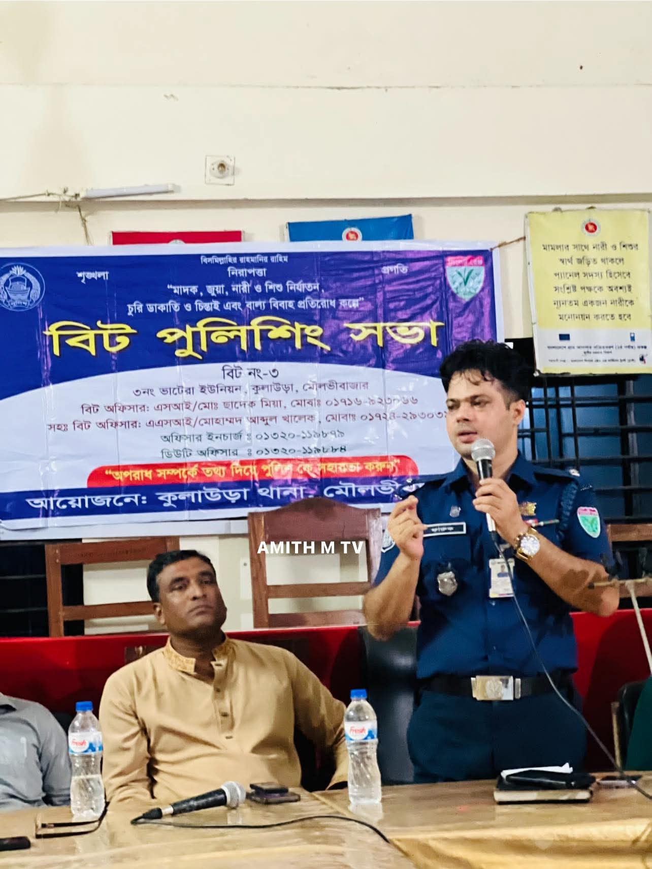 স্টাফ রিপোর্টার।। কুলাউড়া উপজেলার ৩নং ভাটেরা ইউনিয়নে মাদক, জুয়া, নারী ও শিশু নির্যাতন, চুরি, ডাকাতি ও ছিনতাই প্রতিরোধের লক্ষ্যে বিট পুলিশিং সভা অনুষ্ঠিত হয়েছে। এছাড়া, এলাকায় পুলিশ ফাঁড়ি পুনরায় চালুর বিষয়টিও আলোচিত হয়।