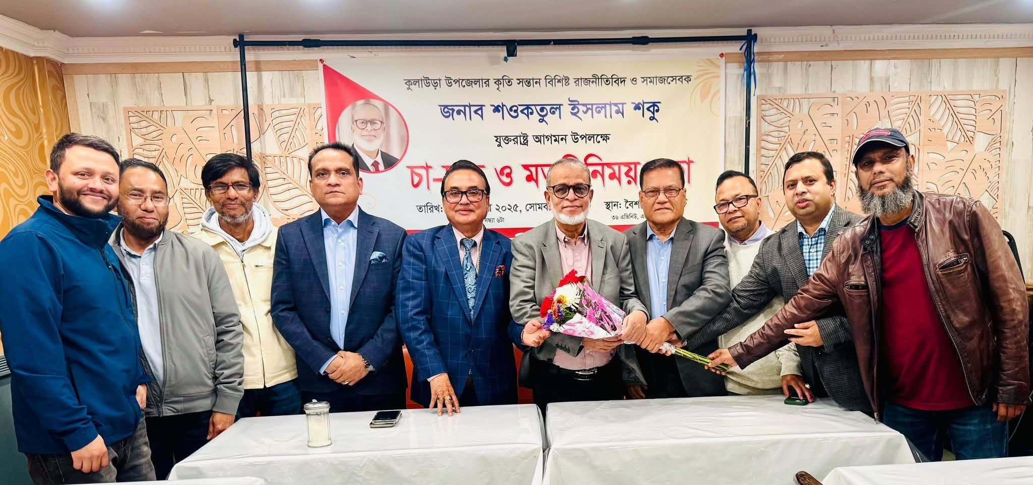 স্টাফ রিপোর্টার নিউইয়র্ক: বাংলাদেশ জাতীয়তাবাদী দল (বিএনপি)- মৌলভীবাজার-২ (কুলাউড়া) আসনের মনোনীত এমপি প্রার্থী এর বর্ষীয়ান নেতা, আলহাজ্ব শওকতুল ইসলাম শকু যুক্তরাষ্ট্রে সংক্ষিপ্ত সফরে এসে প্রবাসী কুলাউড়াবাসীর সঙ্গে চা-চক্র ও মতবিনিময় সভা করেছেন। সভা অনুষ্ঠিত হয় নিউইয়র্কের এস্টোরিয়ার বৈশাখী রেস্টুরেন্টে।