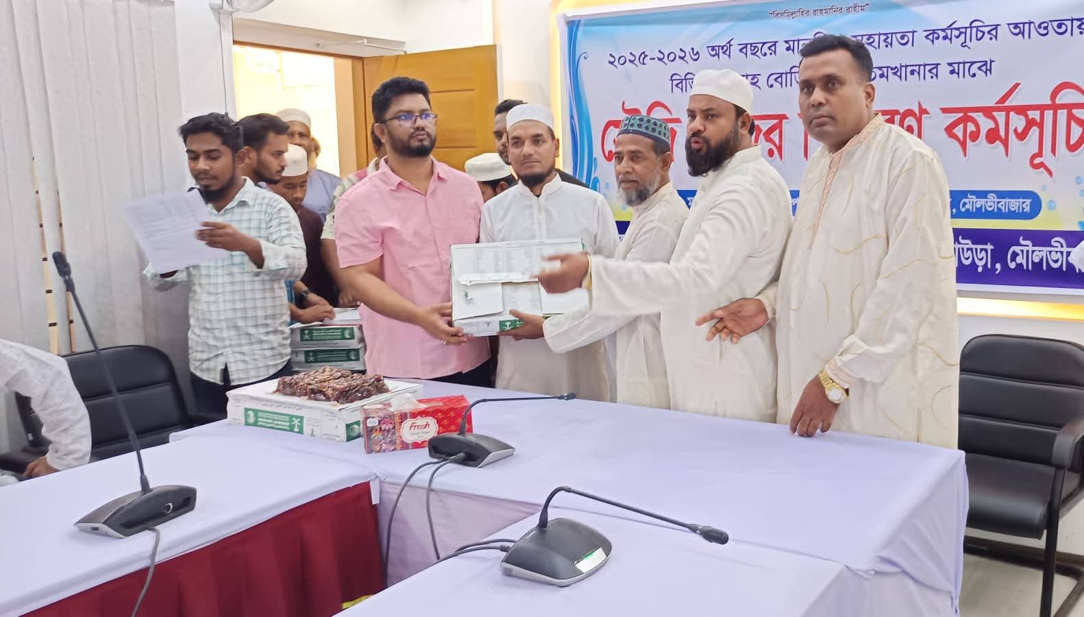স্টাফ রিপোর্টার।। ২০২৫-২৬ অর্থবছরে মানবিক সহায়তার আওতায় ও সৌদি সরকারের দেওয়া কুলাউড়া উপজেলার ৫১ টি মাদ্রাসা ও এতিমখানায় ২ শ ২৪ প্যাকেট খেজুর বিতরন করা হয়েছে। গতকাল বৃহস্পতিবার বিকেলে আনুষ্ঠানিকভাবে খেজুর বিতরন করেন কুলাউড়া উপজেলা নির্বাহী কর্মকর্তা মো মহি উদ্দিন। এসময় উপস্থিত ছিলেন কুলাউড়া উপজেলা বিএনপির সাবেক সাধারন সম্পাদক শামীম আহমদ চৌধুরী, উপজেলা বিএনপির সাবেক সিনিয়র যুগ্ন আহবায়ক বদরুল হোসেন খান, প্রেসক্লাব,কুলাউড়ার সিনিয়র ভাইস প্রেসিডেন্ট ময়নুল হক পবন, সাংবাদিক সমিতির সাবেক সভাপতি মোক্তাদির হোসেন,যুবদল নেতা আলমাছ পারভেজ তালুকদার, কুলাউড়া প্রকল্প বাস্তবায়ন অফিসের কর্মকর্তা শাহিন আহমদ,কামরুল হাসান,ফেরদৌস আহমদ প্রমুখ।