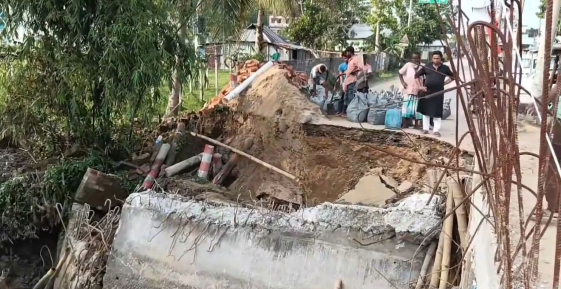 জানা যায়, প্রায় অর্ধকোটি টাকা ব্যয়ে ৩৩ ফুট দীর্ঘ এই ব্রিজটির নির্মাণ কাজ গত প্রায় ছয় মাস ধরে চলমান রয়েছে। তবে ডাইভারশন না থাকায় প্রথম ধাপের কাজের পর অস্থায়ীভাবে যান চলাচল চালু করা হয়। পরবর্তীতে দ্বিতীয় ধাপের কাজ শুরু হলে শনিবার রাতে বৃষ্টির পানি ও উজানের ঢলে গাইডওয়াল ও মাটি ধসে পড়ে।